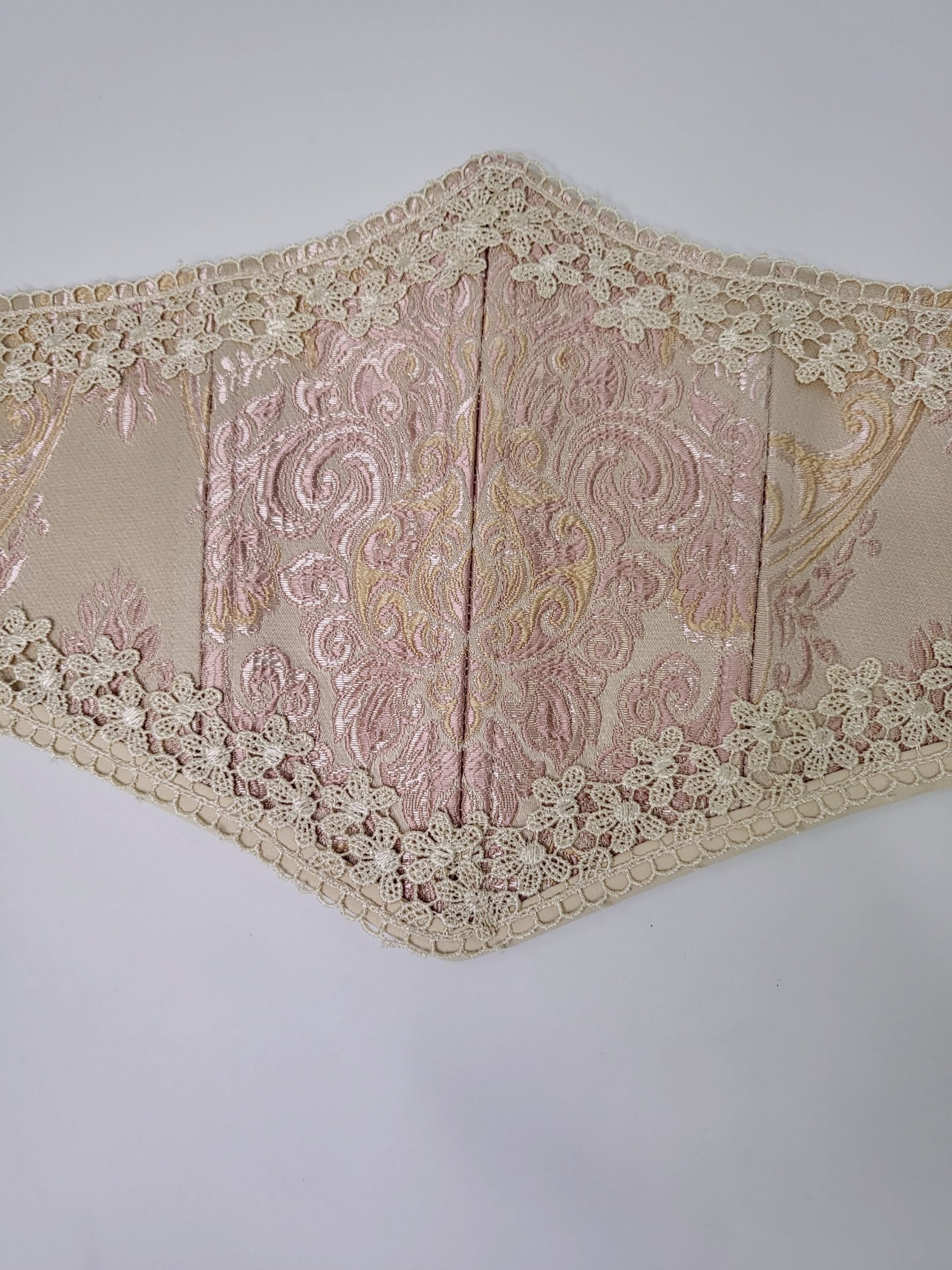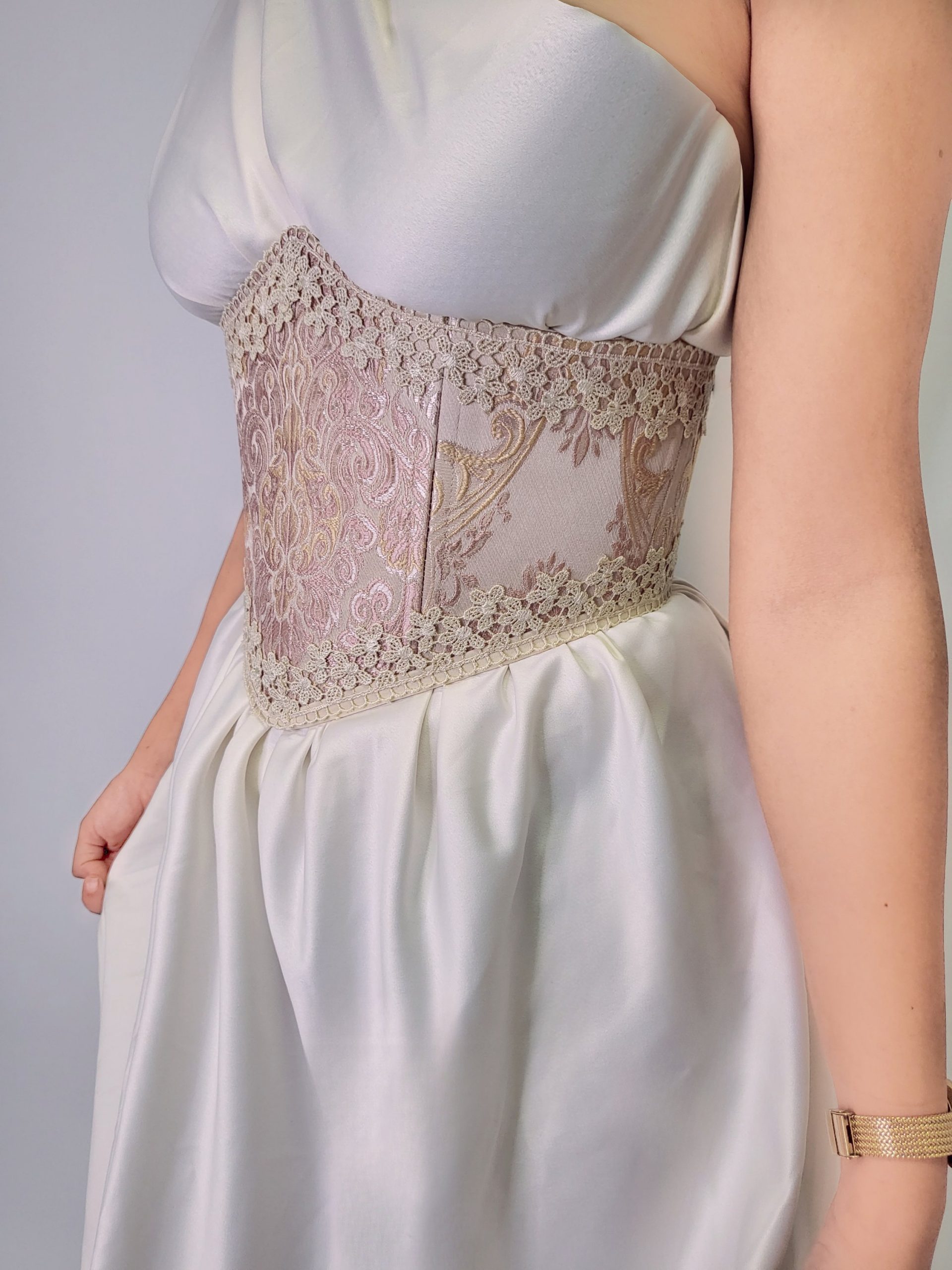 Sublimez votre silhouette avec ce corset underbust rose poudré, une création unique signée Pinky Tunisie. Confectionné à la main dans notre atelier, ce modèle associe un tissu brocart luxueux à des finitions en dentelle ivoire, offrant un équilibre parfait entre élégance, féminité et confort.